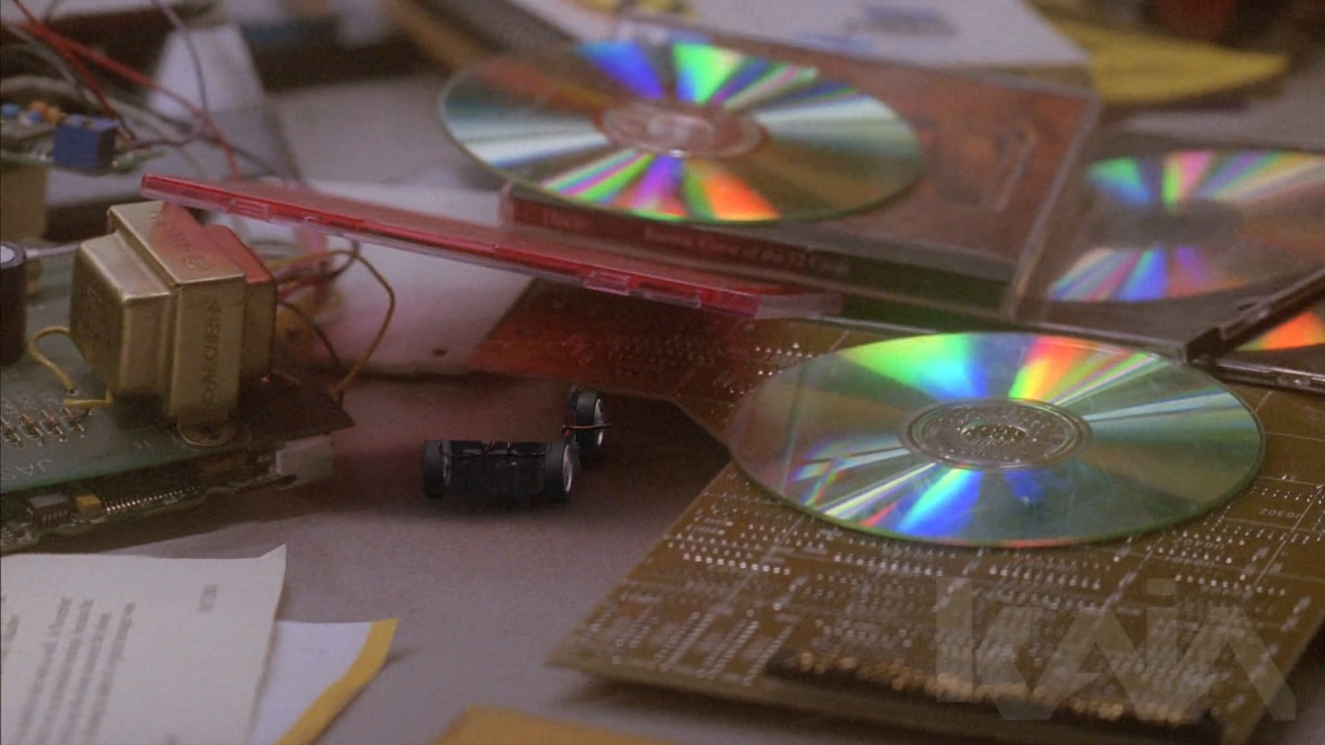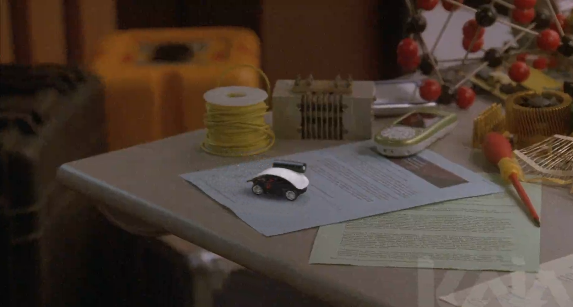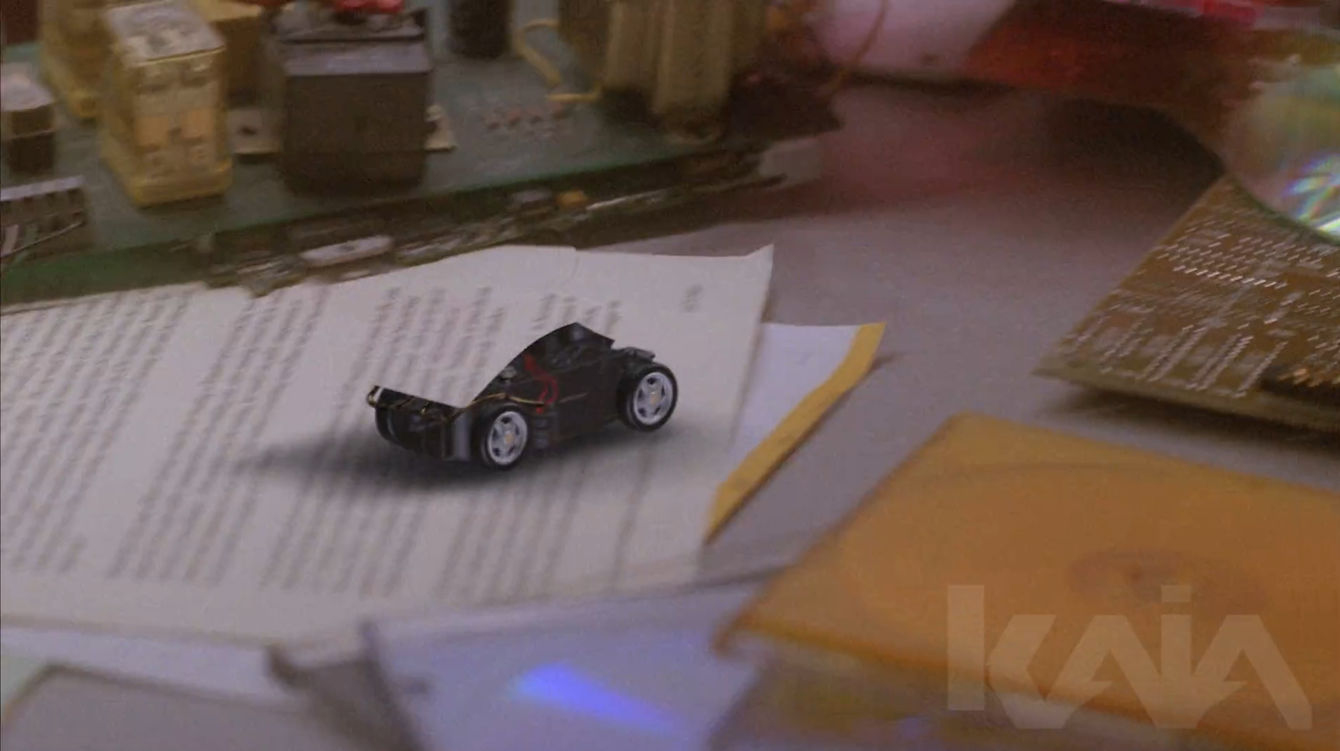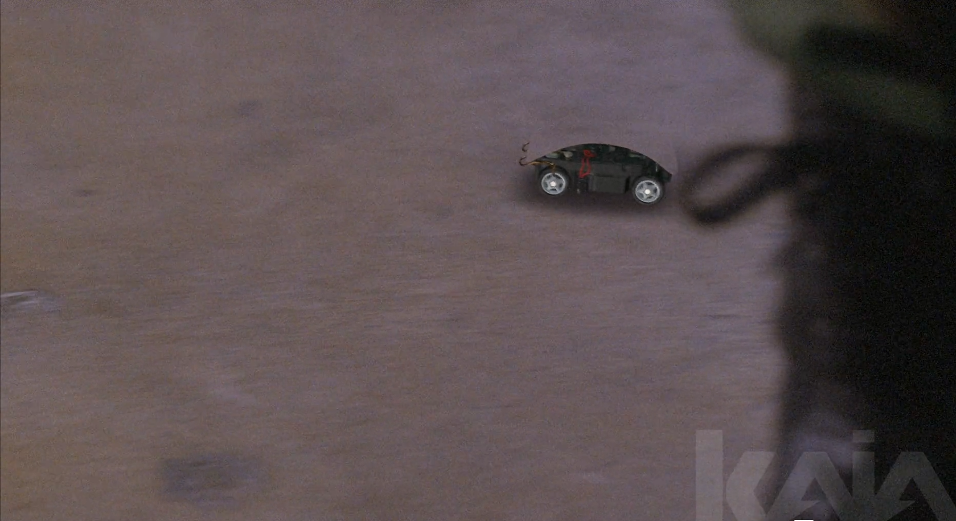A tiny RC surveillance vehicle car with active camouflage. The VFX challenge was rendering its roof mostly invisible while keeping wheels and shadow visible enough to track movement in action sequences.