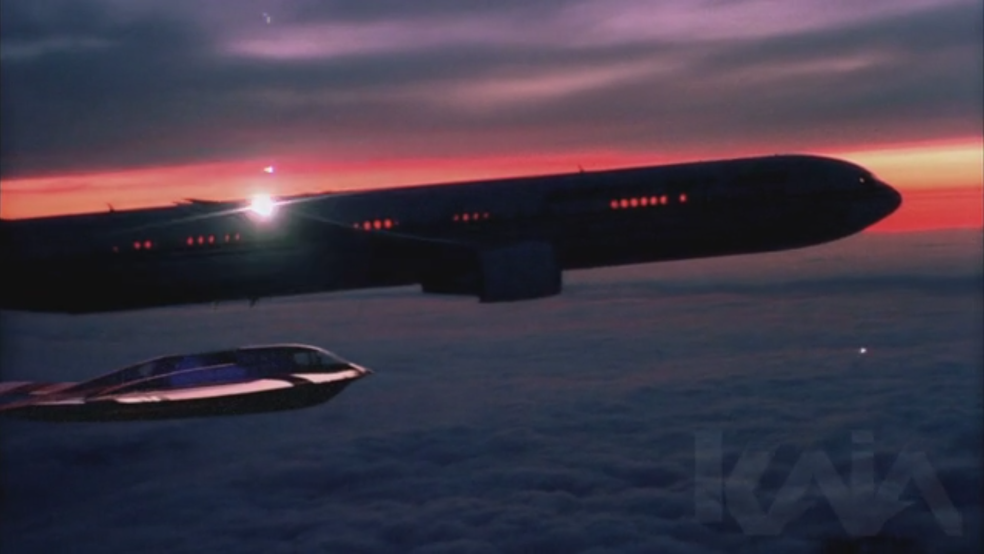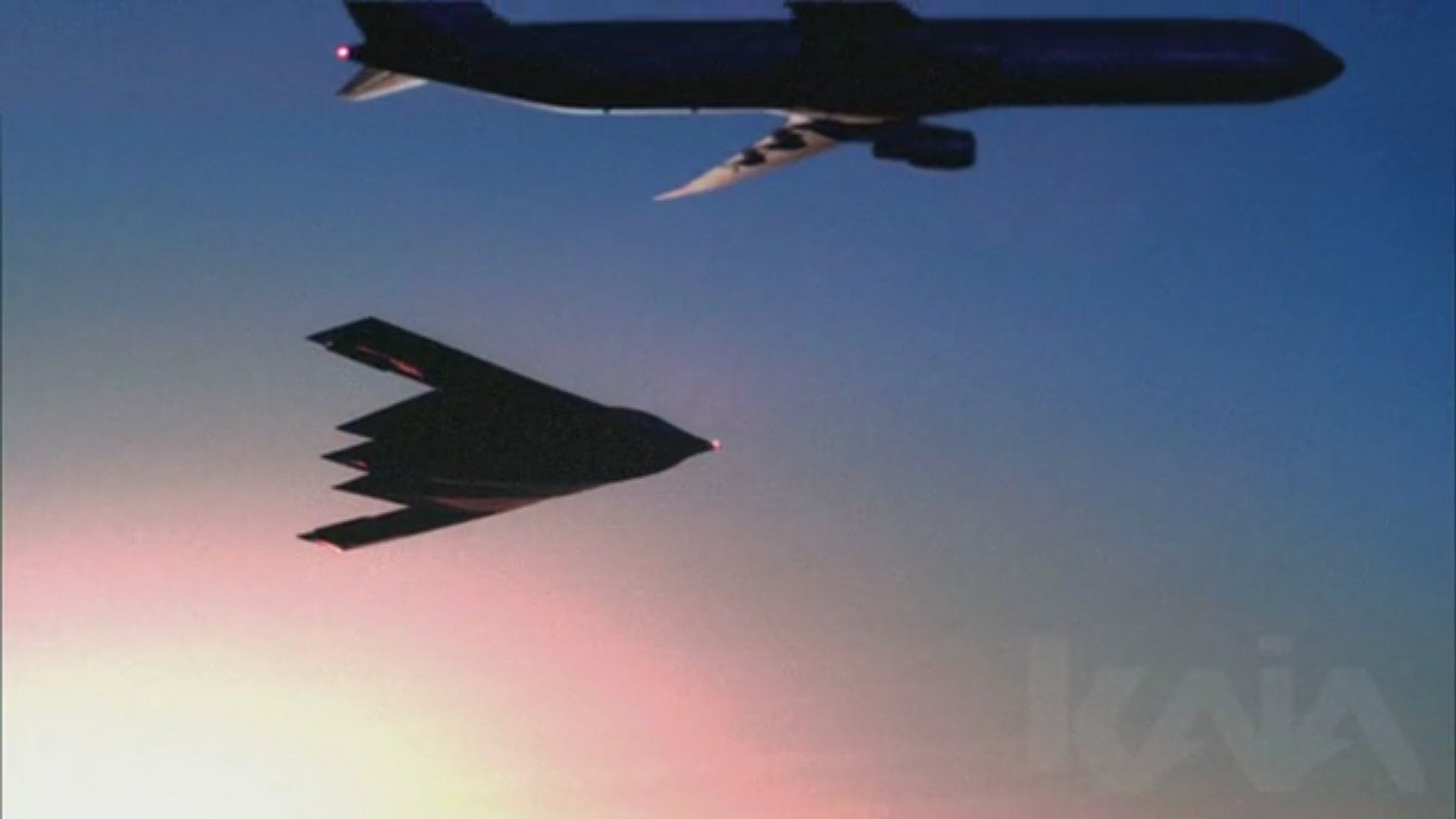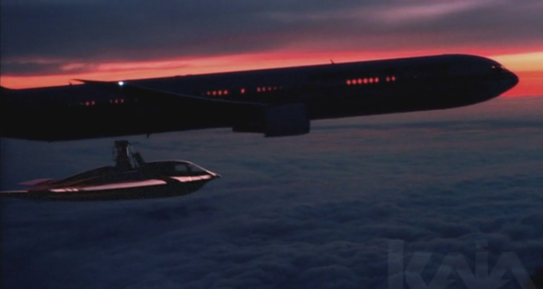 A V2 stealth bomber at high altitude deploys an extended mechanism that docks with a Boeing 777 in flight. The visualization conveyed realism, precision, altitude, and technical feasibility within an implausible scenario.