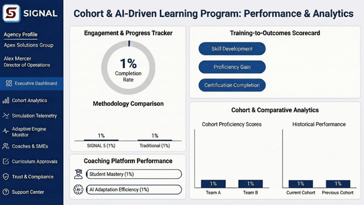 Signal 5 captures real-time learning signals and performance data across every interaction. This gives leaders clear visibility into progress, impact, and workforce readiness so results are measurable and actionable.